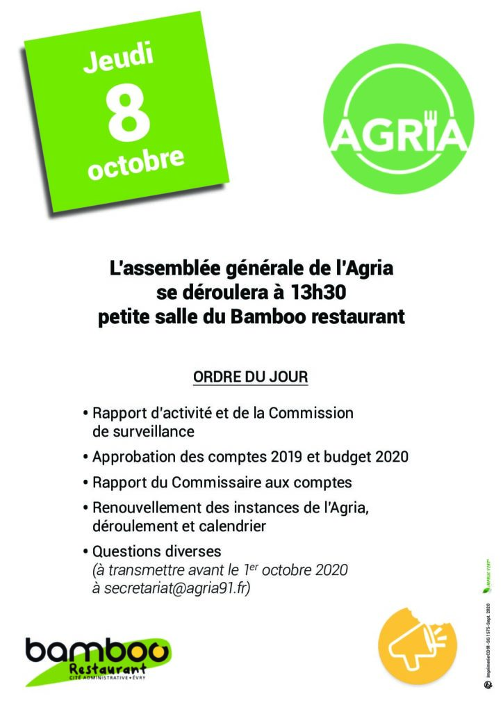 Venez nombreuses et nombreux à l’Assemblée générale de l’Agria pour prendre les décisions qui concerne votre Bamboo restaurant. Cette assemblée se déroulera dans la petite salle du restaurant. Voici l’ordre du jour :