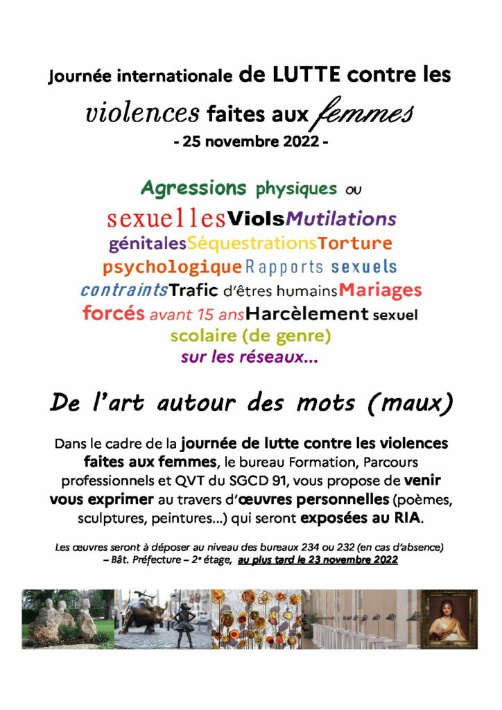 Dans le cadre de la journée internationale de lutte contre les violences faites aux femmes, venez assister à l’exposition éphémère « De l’art autour des mots (maux) » qui réunit les œuvres personnelles réalisées par les agents sur ce thème